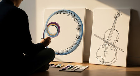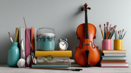 A vibrant workspace showcasing a violin, art supplies, books, and an alarm clock, embodying creativity and inspiration in a modern, minimalist setting.