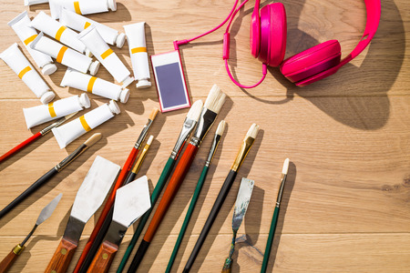 Top view of wooden desktop with oil paint tubes, brushes, other drawing tools, smartphone and pink headphones