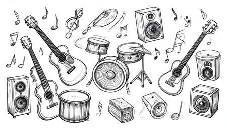 A hand-drawn collection of musical instruments and audio equipment, including acoustic guitars, a drum kit, and speakers, interspersed with musical notes