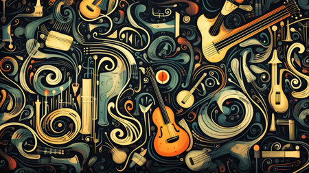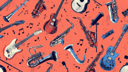 musical instruments illustration, illustrations of guitars, saxophones, and trumpets are spread throughout the backdrop, perfect for music-inspired projects