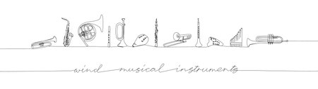 Wind musical instruments set one line art. Continuous line drawing of french horn, tuba, surma, saxophone, ocarina, trumpet, trombone, sopilka, clarinet with an inscription, lettering.