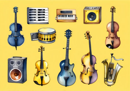 Vibrant display of various musical instruments arranged on a yellow background, showcasing a harmony of sound, rhythm, and artistic creativity. Perfect for music-related themes.