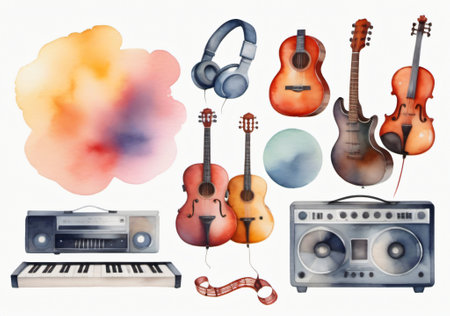 Watercolor illustration of musical instruments. Acoustic guitar, electric guitar, synthesizer, vinyl record and headphones.