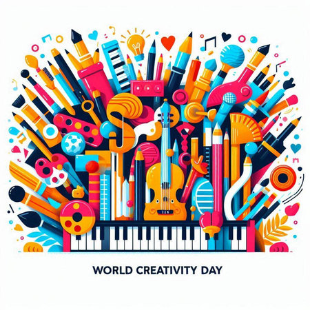 World Art Day poster design with music instruments and accessories. Vector illustration