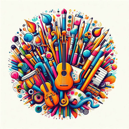 A vibrant collection of musical instruments, sheet music, and art supplies set on a table, showcasing creativity and musical artistry for inspiration.