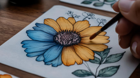 A hand painting a colorful flower with blue and yellow petals on paper, using fine brushes, on a wooden surface. Art creativity concept