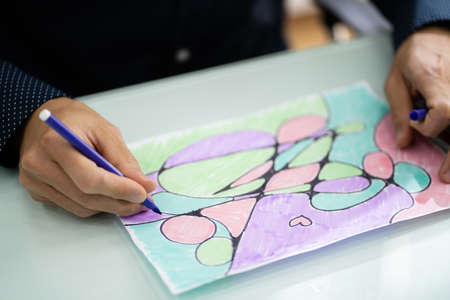 Image of woman coloring, adult coloring book trend, for stress relief. top view. colorer - antistress with colored pencils. Adult coloring books. The woman draws thereby relieves stress
