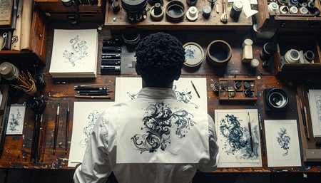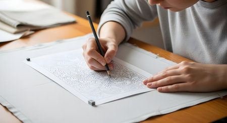 A close-up view of an artisan using a pencil to draw intricate floral patterns on paper, highlighting craftsmanship and creativity in a serene workspace.