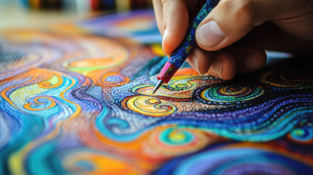 Close-up of an artist hand using colored pens to add details to a drawing, with a focus on the vibrant colors and creative process