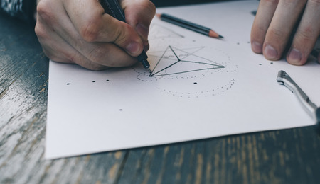 Hand making a perspective drawing with black and white figures by taking a black pencil.