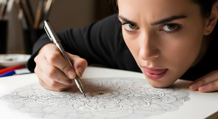 A young female artist with an intense look of concentration, sticking her tongue out slightly, leans over her desk to draw a complex and detailed mandala with a fine-tipped pen. The image captures the focus and dedication required for intricate artwork.