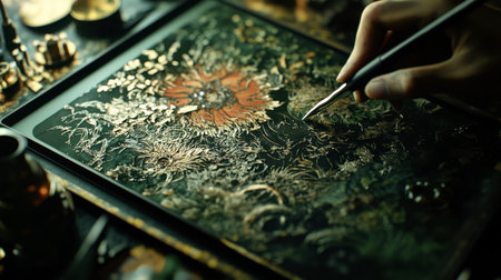 A skilled artisan delicately engraves a vibrant floral design on a metal surface, showcasing intricate details and craftsmanship in a creative workshop setting.