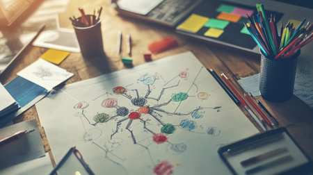 Creative team learning tools with concept maps, study charts, and collaborative materials neatly placed
