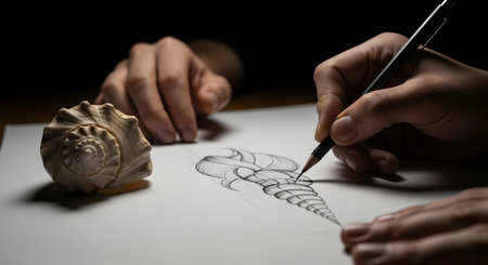 Close-up of an artists hands drawing a seashell with a pencil on white paper, illuminated by dramatic lighting.