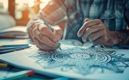 An artist s hands coloring an intricate mandala design with colored pencils on a wooden table Natural light illuminates the scene softly