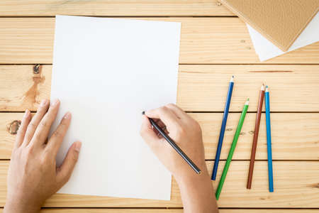 Hands drawing on paper on wooden table background