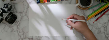 Overhead shot of male artist drawing on sketch paper with painting tools on marble worktable