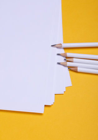 Pencils with white blank sheets of paper on yellow background