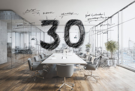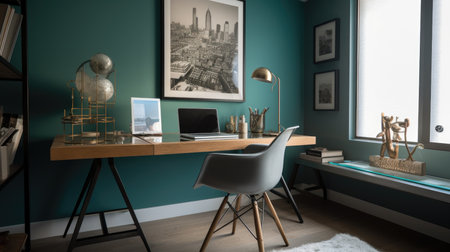 Interior design of Home Office in Mid-century modern style with Desk decorated with Wood, Leather, Metal, Glass, Concrete material. Minimalist architecture. Generative AI AIG24.