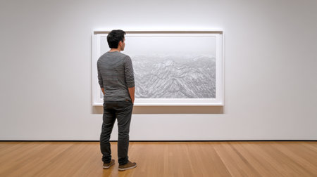 A thoughtful individual stands in front of a large black and white artwork in a modern gallery, engaging with art in a serene environment.
