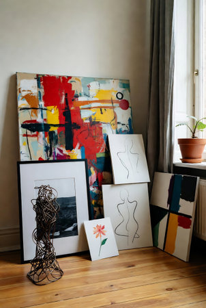 A vibrant art studio showcasing a colorful collection of artwork on a table and wall, illuminated by natural light, creating an inspiring creative space for artists.