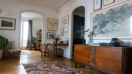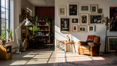 a gallery wall with a mixture of paintings, photographs, and hangings, created with generative ai