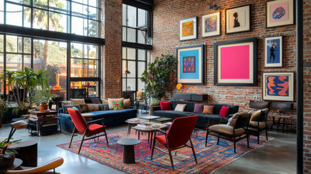 A stylish modern living room featuring exposed brick walls, colorful artwork, various seating options, and lush greenery, perfect for relaxation and social gatherings.