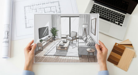 A living room interior design sketch is presented with a laptop and color swatches to visualize the project and plan the home decor.