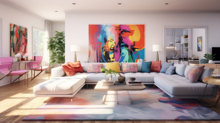 Stylish modern living room featuring vibrant colors, artistic decorations, and a comfortable atmosphere, perfect for contemporary home aesthetics.