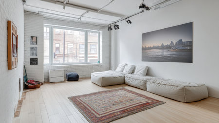 Bright and airy minimalist living room showcasing bean bag chairs and a stunning art print. Ideal setting for relaxation, creativity, and inspiration in an urban environment.