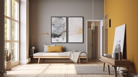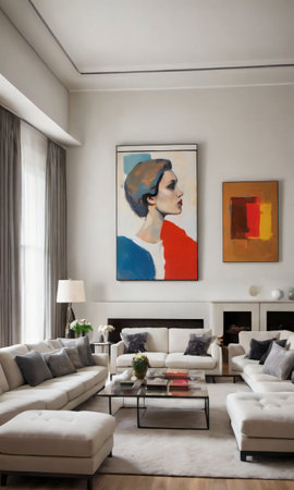a minimalist living room with a pencil sketch on the wall and modern furniture, created with generative ai