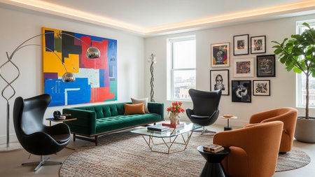 A vibrant living room showcasing eclectic wall art and stylish furniture, creating a cozy and inviting atmosphere perfect for contemporary living and relaxation.