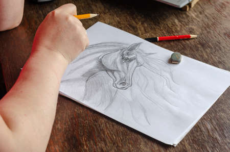 A middle-aged woman draws with a pencil on white paper. An adult woman sits at a wooden table and draws a horse. Art, hobby, and recreation. Artist talent