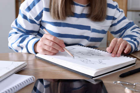 Woman drawing in sketchbook with pencil at wooden table, closeup