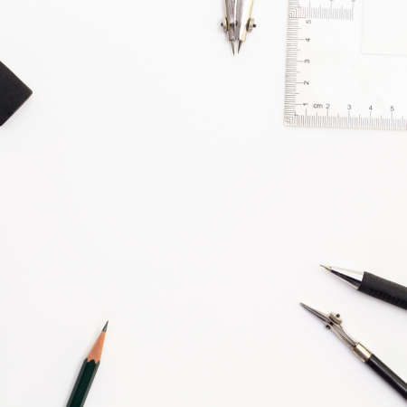 top view of paper, smartphone, pencil, pen, ruler and compasses