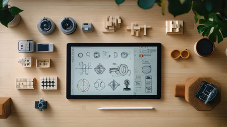 Flatlay of a clean workspace with a tablet showing AI tools for modeling D shapes, with ample space around it for text placement.
