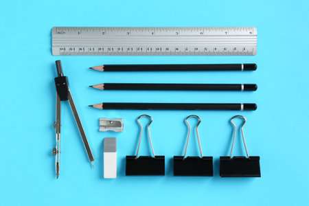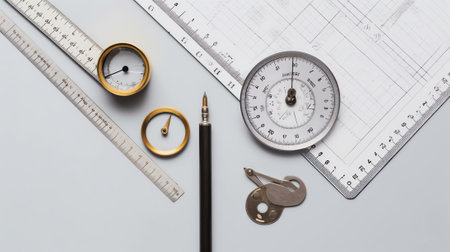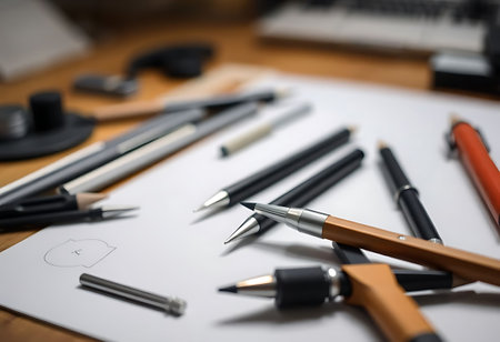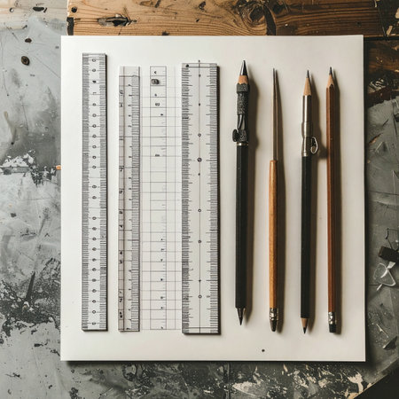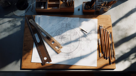 A collection of essential drafting tools lies ready on a designer's workbench.