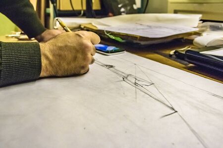 Girl architect draws a plan, graph, design, geometric shapes by pencil on large sheet of paper at office desk.