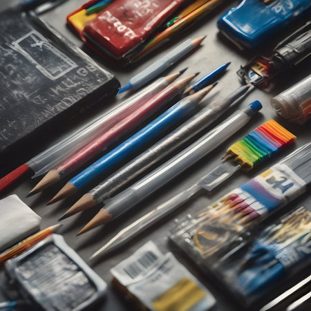 An AI generated illustration of a wooden desk with a selection of colored pencils and other stationery items scattered across the surface