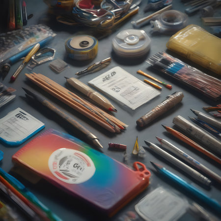 Vibrant assortment of art supplies is thoughtfully arranged, showcasing brushes, pencils, paints, and geometric shapes against a light background.