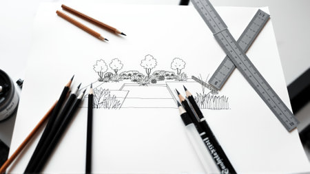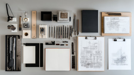 A clean and organized artistic workspace featuring various drafting tools, pens, a sketchbook, and clean sheets, ideal for designers and creators.