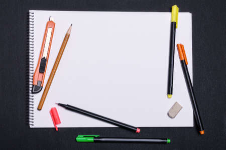 On the album sheet are pencils, colored felt-tip pens, an elastic band and a clerical knife for sharpening pencils. Place of the artist