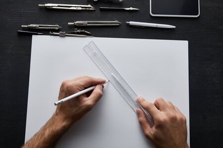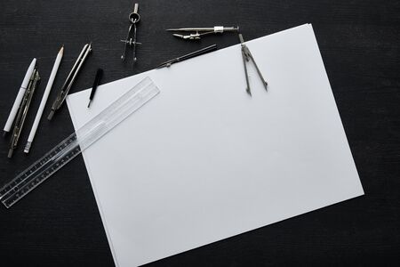 white paper with copy space and compasses, ruler, pencils on black and wooden table