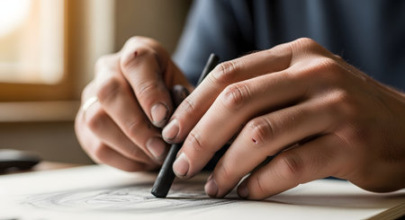 Just inspired Closeup top view of man sketching on paper while sitting at his working place : Generative AI