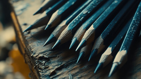 Close-up of sharpened pencils arranged on a rustic wooden surface, highlighting texture and details for use in educational or artistic contexts.
