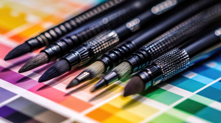 A detailed arrangement of premium artist brushes on a vibrant palette, showcasing the intricate design and variety of colors, perfect for creative inspiration and art projects.