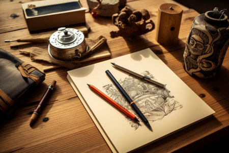 Creative Expressions Unleashed: Sketch Book and Rubber Stamp Adorn the Wooden Desk [AR 3:2]