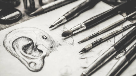 Close-up of an artistic ear sketch surrounded by various drawing tools including brushes and pencils on a creative workspace, inspiring artistry and illustration.