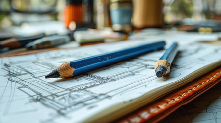 Architectural sketch pencils. Wood table displays technical drawing skill.