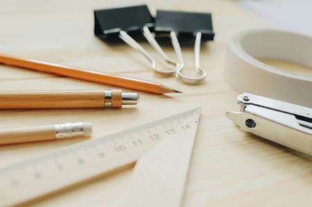 Wood pencil, pen, triangle, briefpapier clips, hefter on the desk in daylight. Office table in daylight